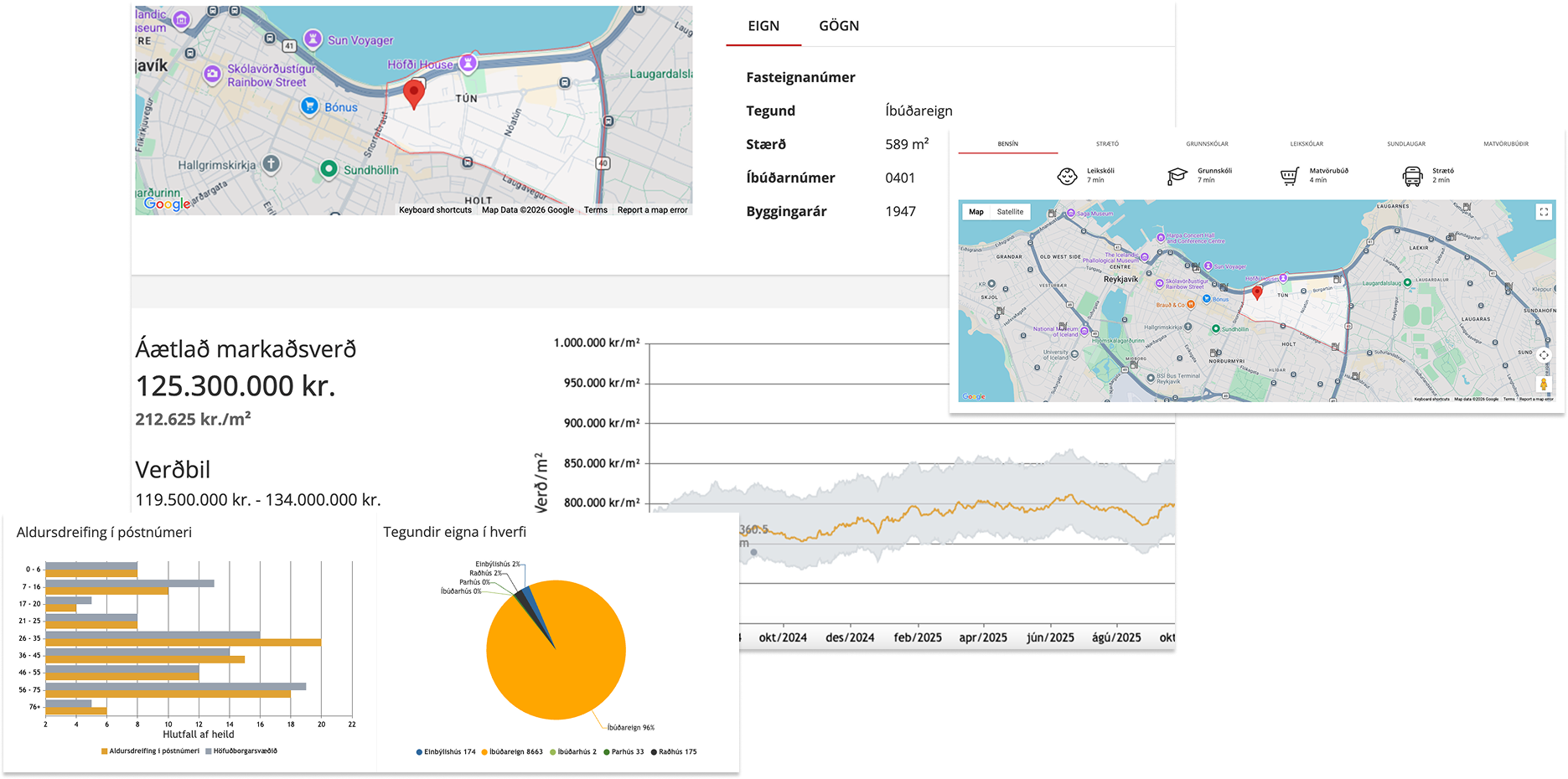 Hægt er að nálgast ítarlegar upplýsingar um áætlað markaðsvirði fasteignar sem byggja bæði á opinberum upplýsingum um fasteignir auk upplýsinga um þróun á fasteignamarkaði.
